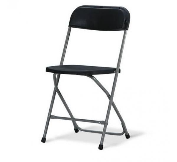 Eenvoudige, snel op te zetten en eenvoudig te vervoeren klapstoel met zwarte kunststof rugleuning en zitting.