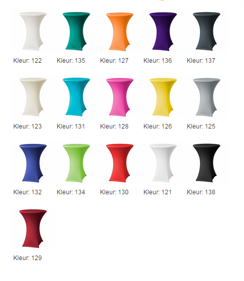 Statafelrokken / -hoezen zijn in stretch kwaliteit, diameter tafelblad v.a. 80-85cm, te koop in elke gewenste kleur. Denk aan bv. rood, wit, blauw (div. tinten), paars, roze, groen (div. tinten), oranje, geel, grijs / zilver, antraciet en zwart.